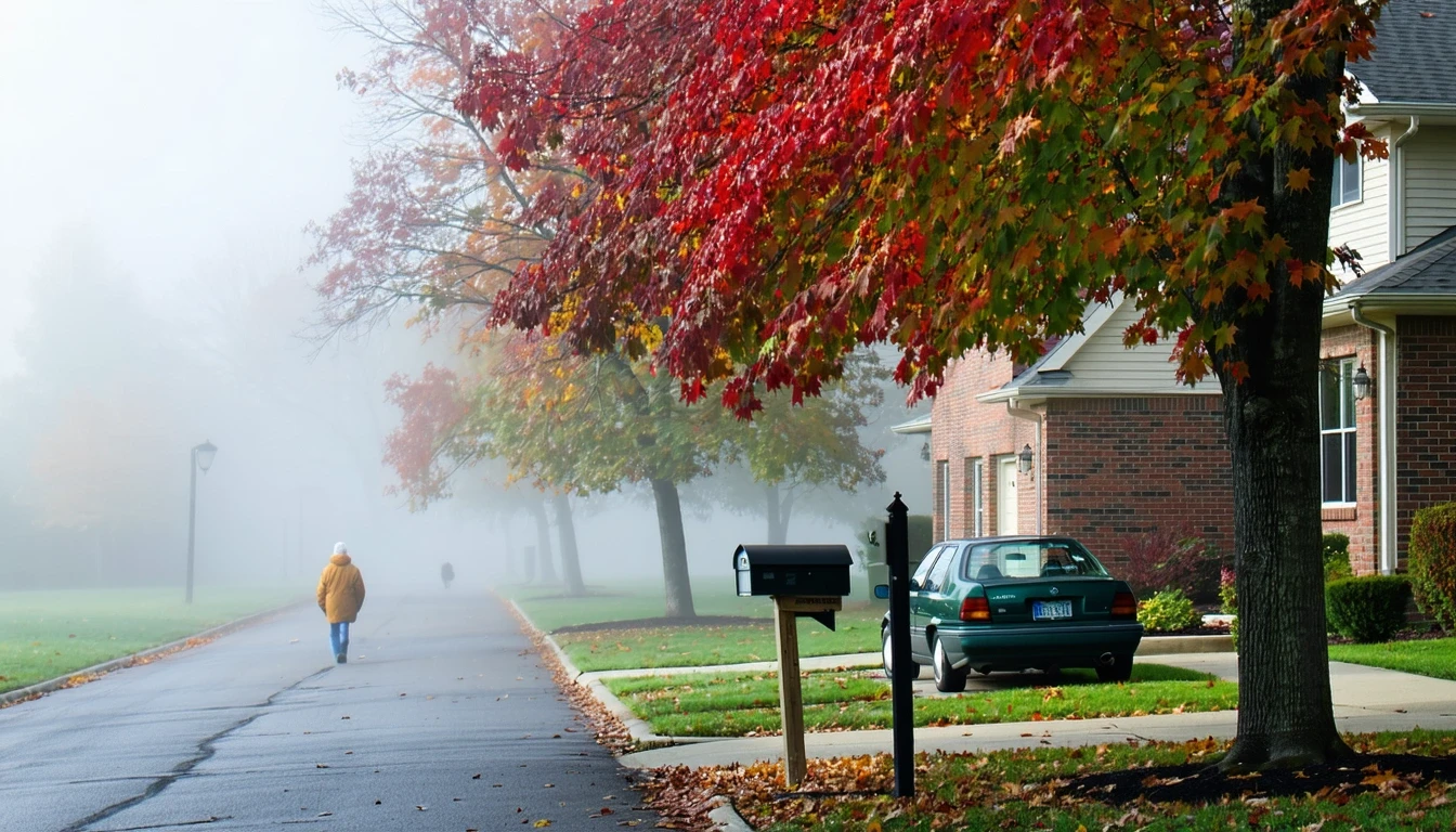 Misty morning street in Farmington Hills with foggy sidewalks, mailboxes, and parked car under a red maple tree.