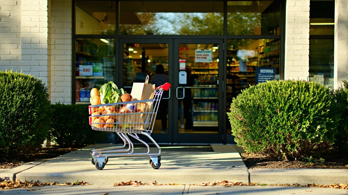 A half-full grocery cart at the entrance of a local market in Fishers, Indiana on a sunny day.