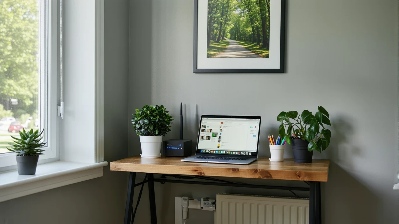 A home office corner with an ethernet cable connecting to a modem and router on a desk.