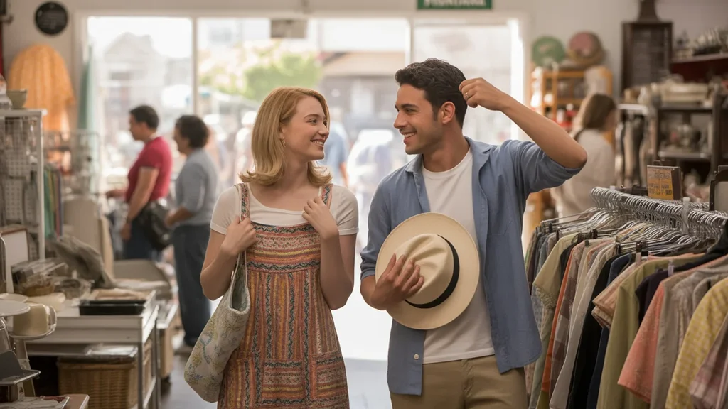 Two friends enjoying budget-friendly shopping at a thrift store in Fontana, CA