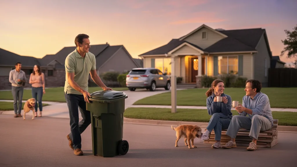 A man takes out the trash at dusk in front of his Frisco, Texas home while his wife waves to a neighbor.