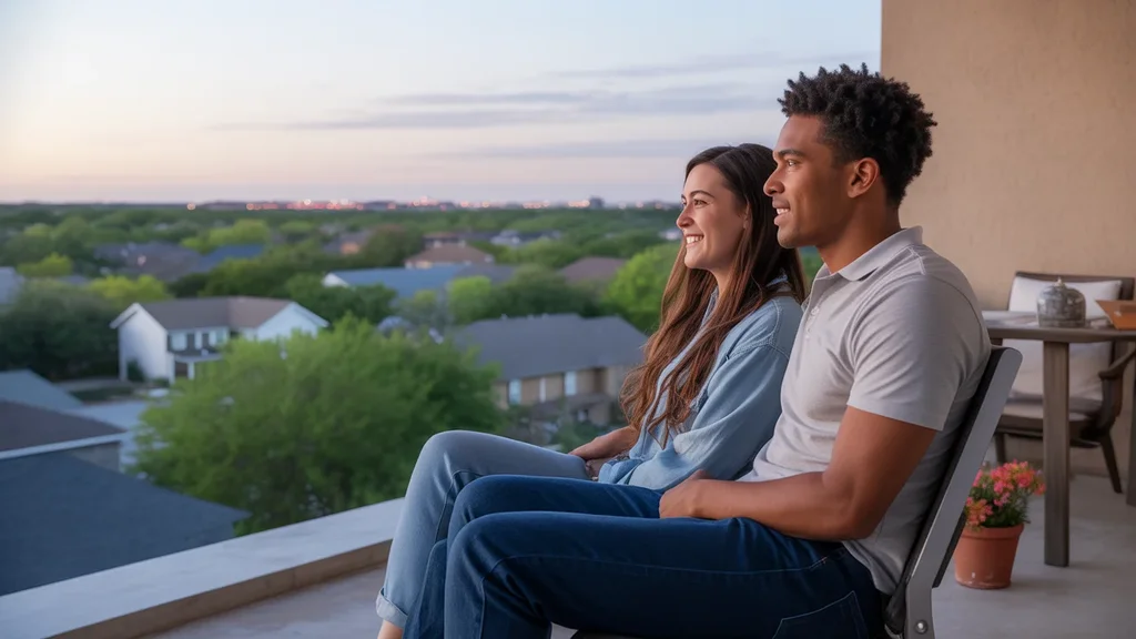 A couple savors a peaceful evening on the balcony of their budget-friendly apartment in Garland, Texas.