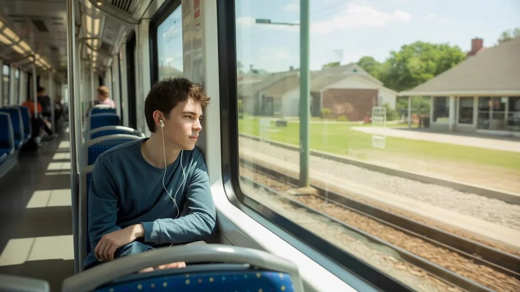 Teenage boy riding DART light rail train alone in Garland, TX while listening to music