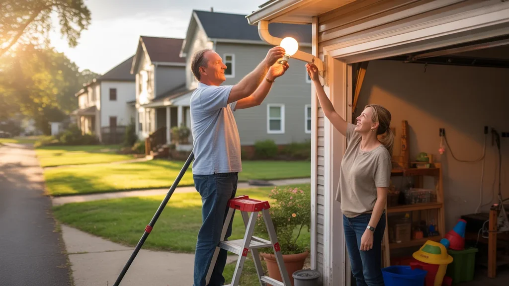 Man changing lightbulb outside garage of suburban home in Georgetown, Kentucky
