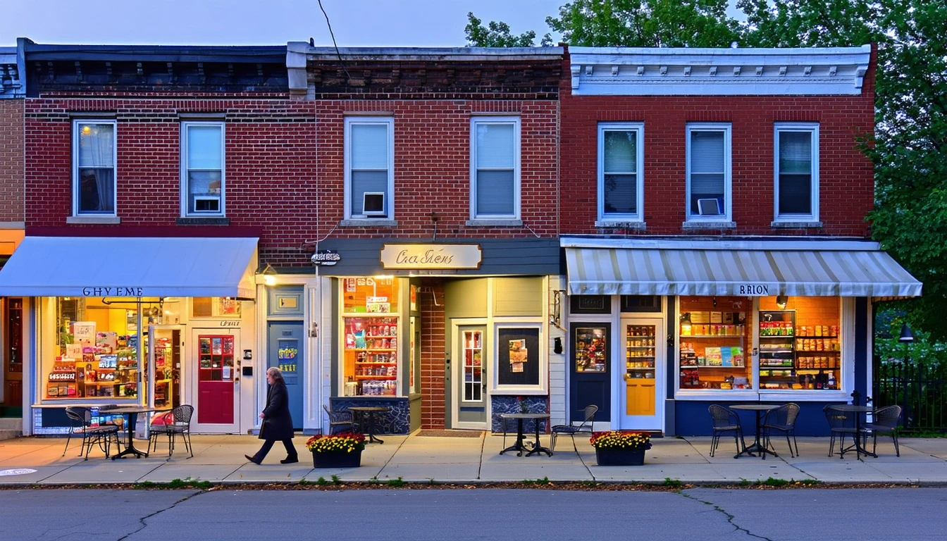 A quiet suburban street at dusk, showing a strip of local storefronts beside a residential block with single-family homes.