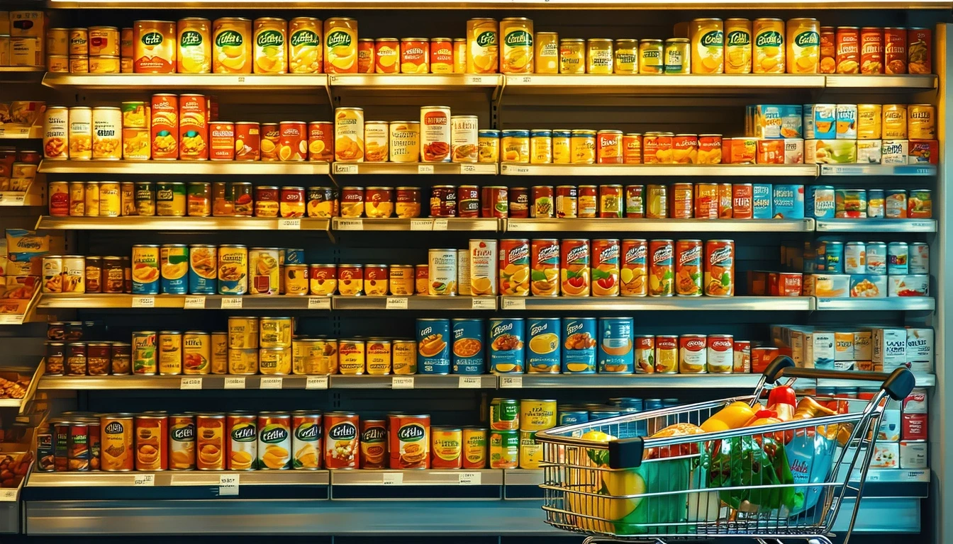 Neatly organized canned goods on a shelf in a modest Germantown, MD grocery store.