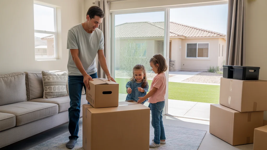 Family unpacking in their new Gilbert, AZ home on moving day