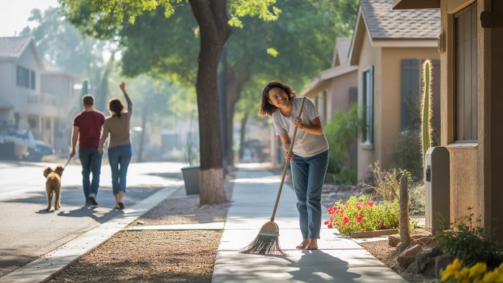A woman sweeps her front porch in a peaceful Gilbert, Arizona neighborhood on a sunny morning.