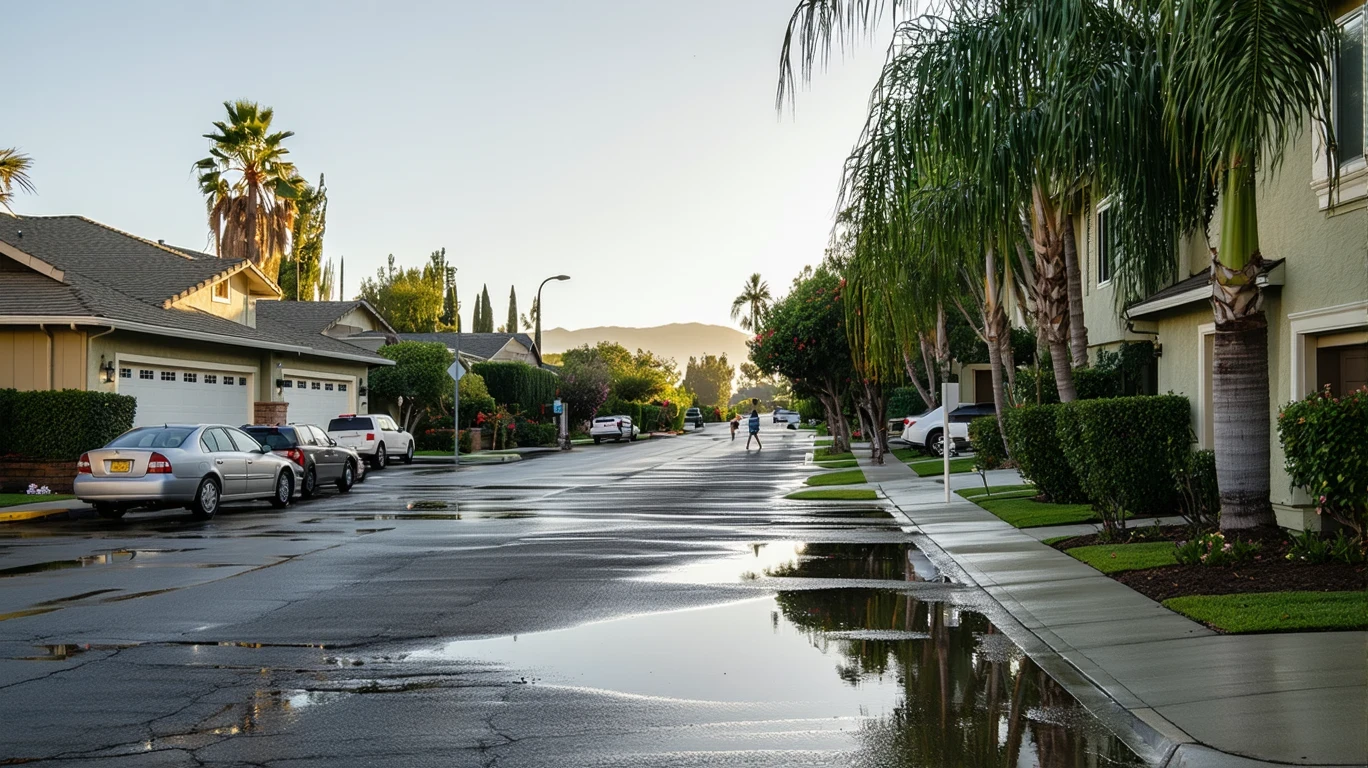 A suburban street in Gilroy, California after a rain shower, with palm trees reflected in puddles on the sidewalk and a person walking their dog.