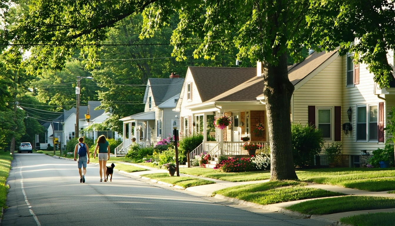 A peaceful residential street in Gladstone, Missouri with ranch-style homes and a couple walking their dog on the sidewalk.