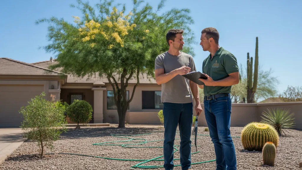 New homeowner discussing landscaping plans with contractor in front yard of modern ranch home in Glendale, Arizona