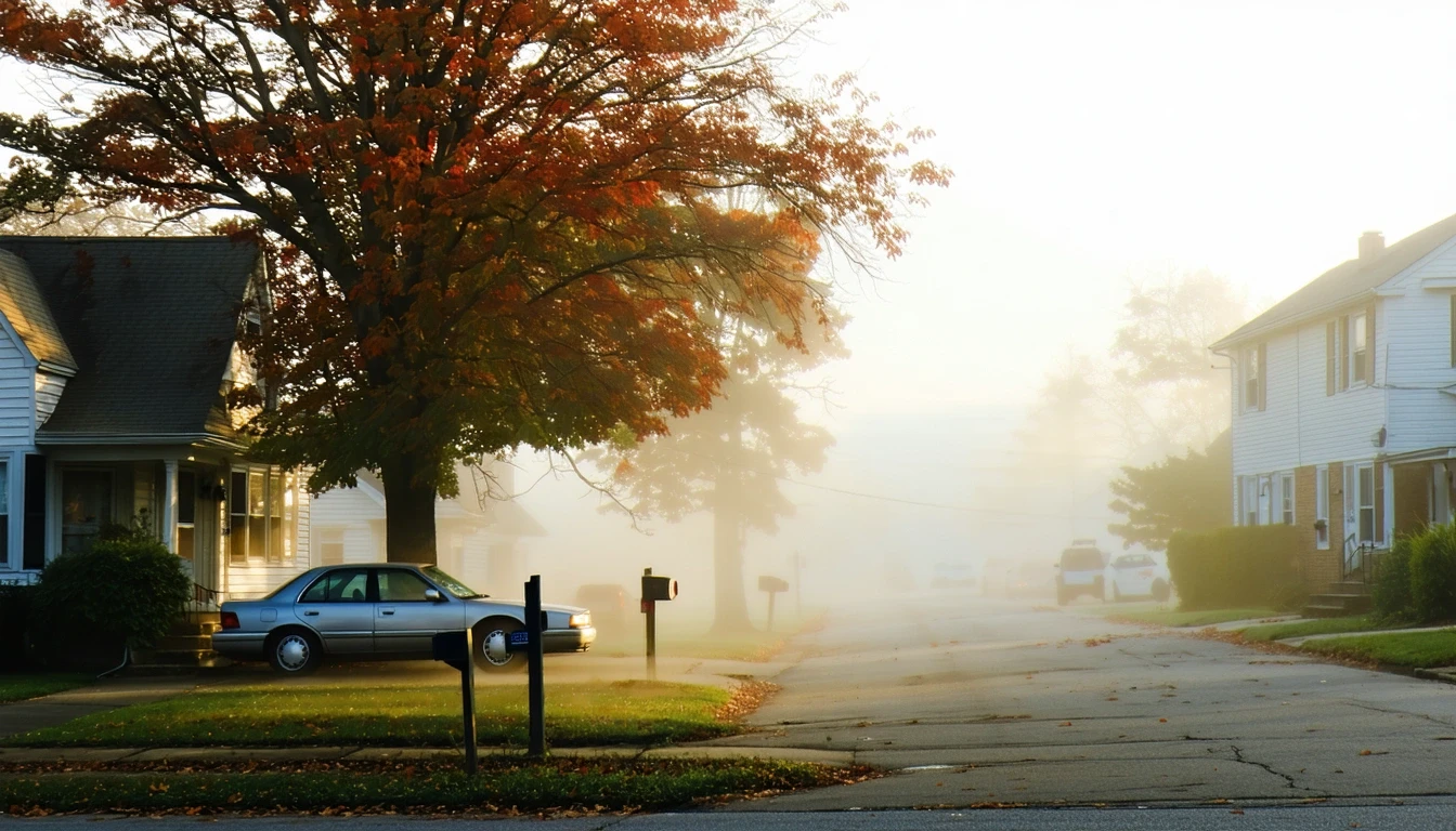 A quiet residential street in Gloucester Township on a misty fall morning.