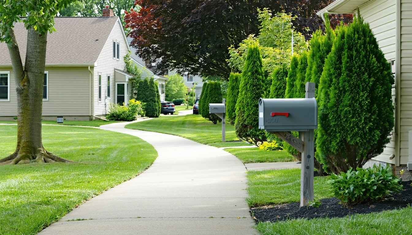 A sidewalk curving past a row of mailboxes in a sunny suburban neighborhood.