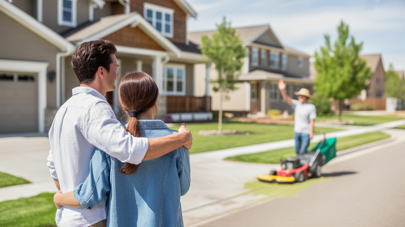 Couple standing in driveway of new craftsman home in Golden, CO with friendly neighbor waving while mowing lawn