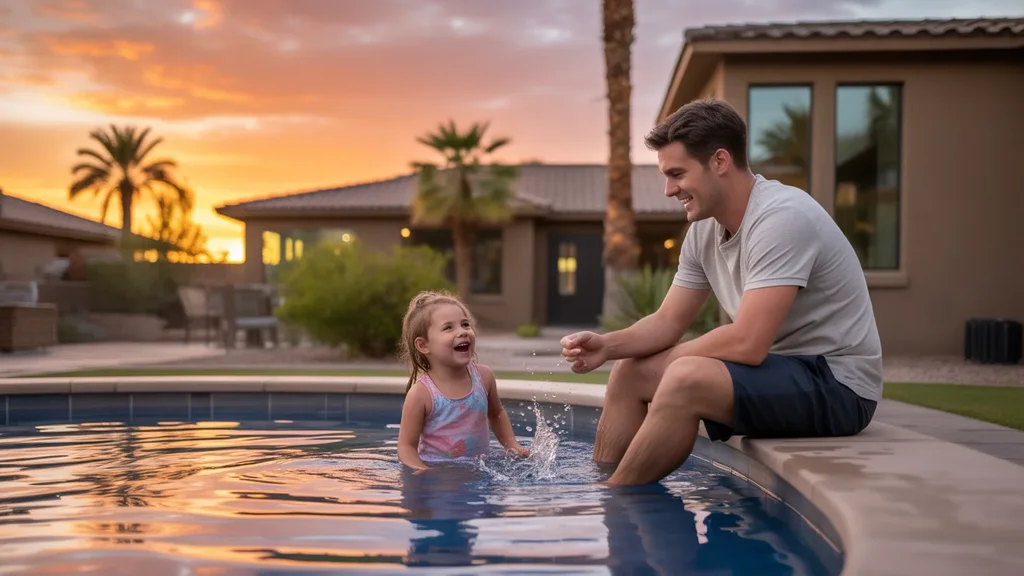 Father and daughter enjoying a backyard pool at sunset in Goodyear, Arizona