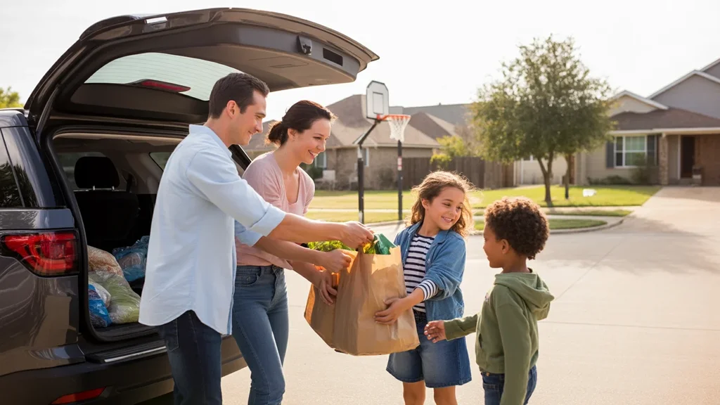 A young family unloads groceries in the driveway of their suburban Grand Prairie, Texas home at sunset.