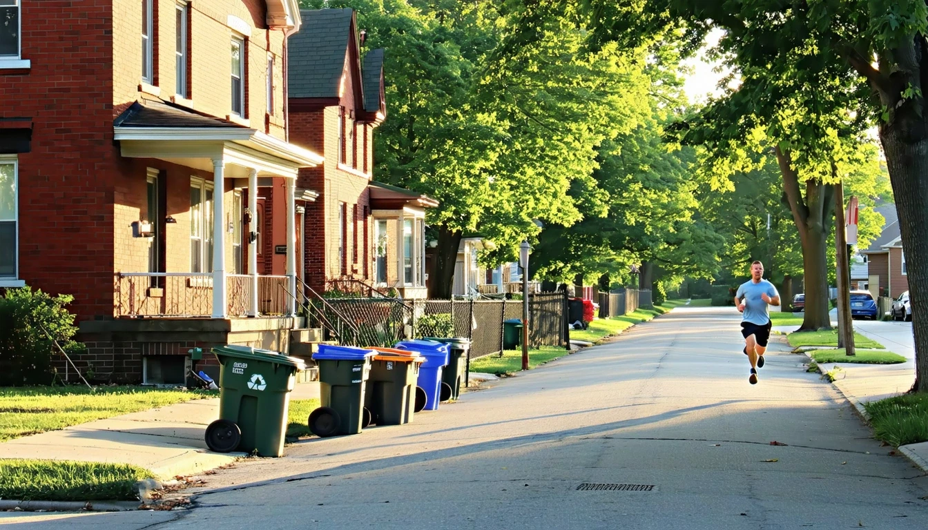 Red-brick homes line a quiet Granite City street with bins out and a jogger passing by