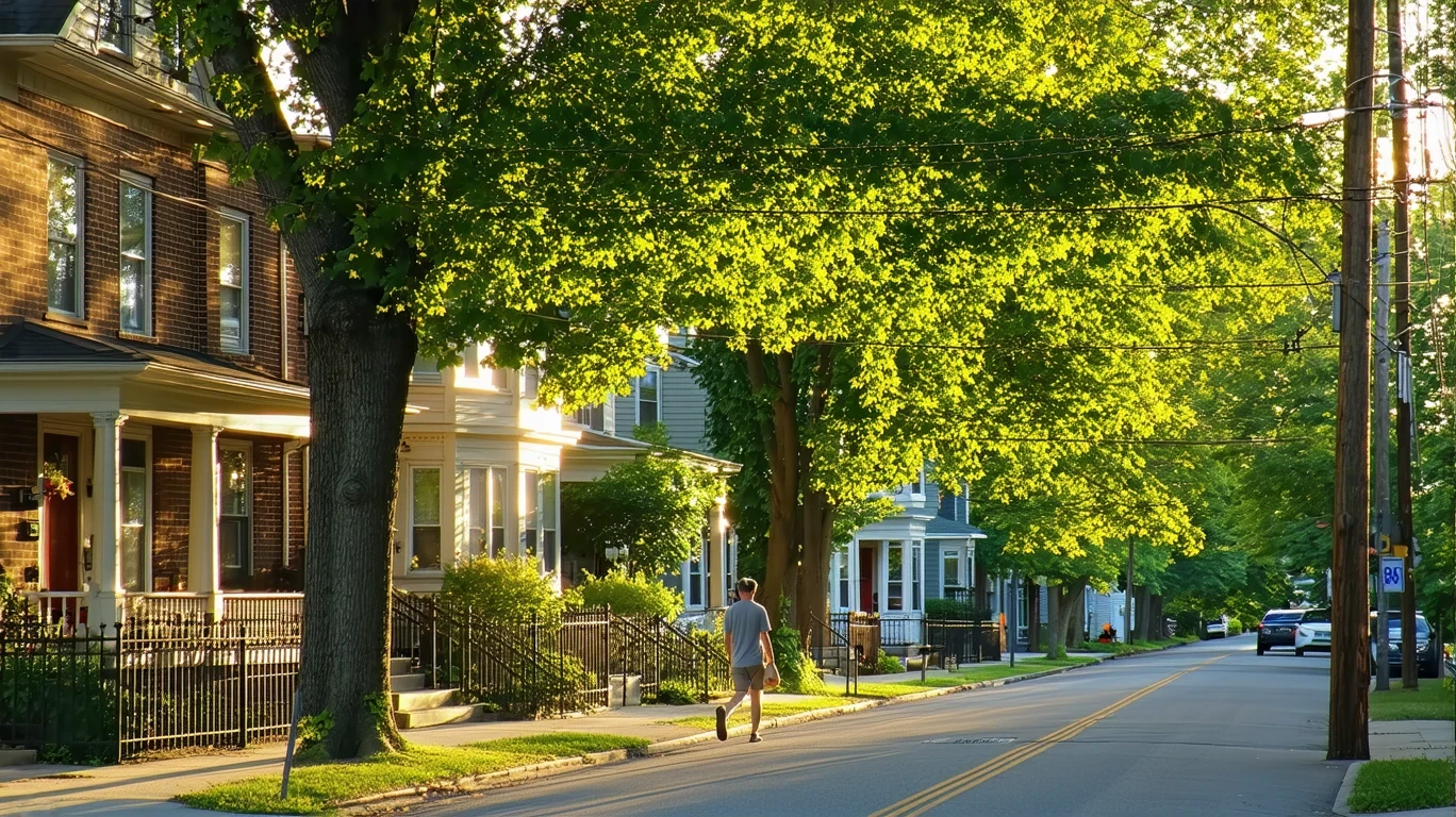 Tree-lined residential street in Hamilton, Ohio with sunlight filtering through maple leaves onto sidewalk