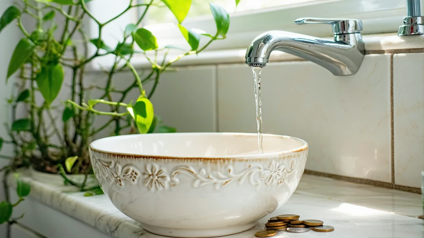 A leaky bathroom faucet dripping into a ceramic bowl with coins inside.