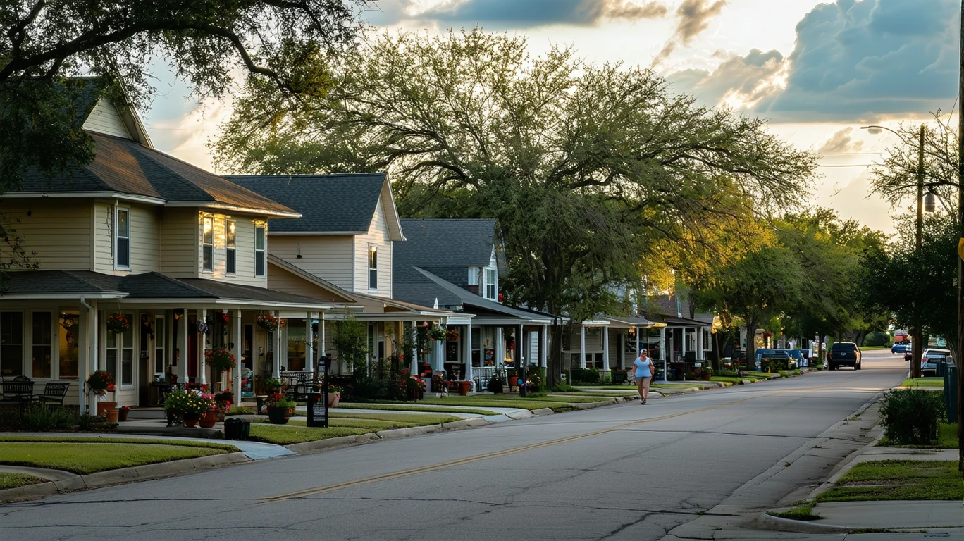 A quiet suburban street in Hutto, Texas at dusk, with small homes on one side and closed storefronts with patios on the other. One person walks along the sidewalk.
