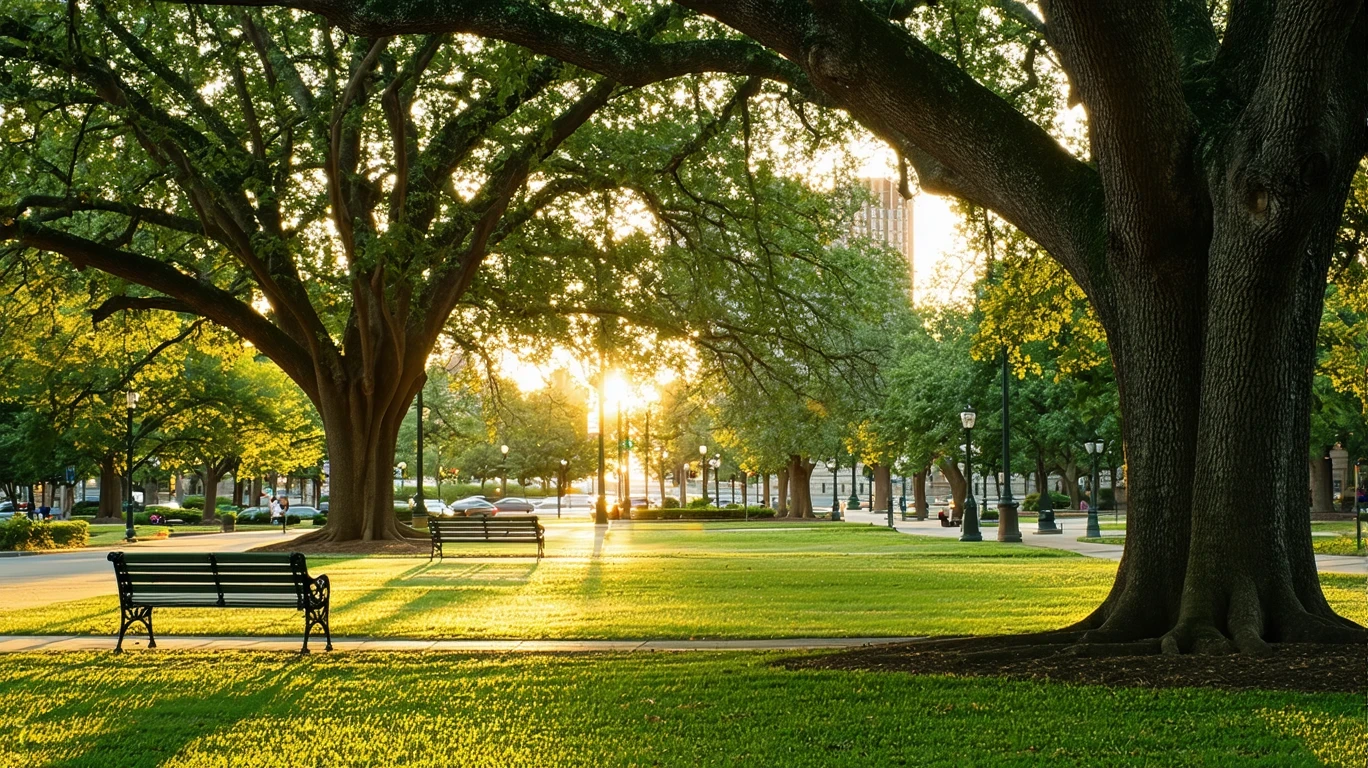 A peaceful park lawn beneath old oak trees, with empty benches and golden afternoon light.