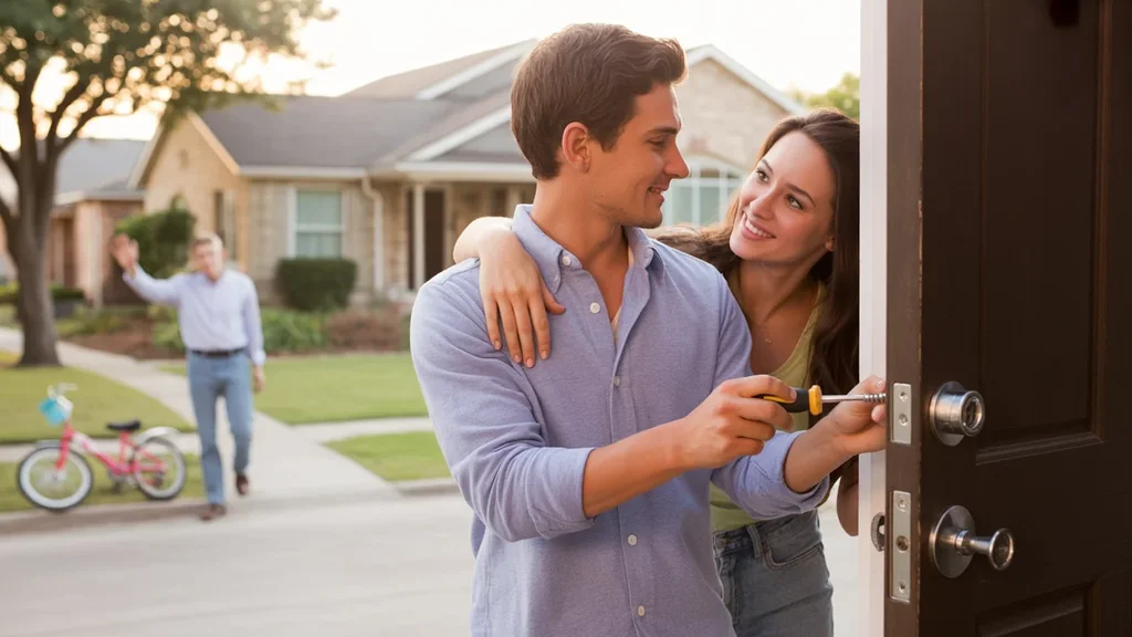 A couple stands in the doorway of their suburban home in Irving, TX, as the man fixes a loose door handle.
