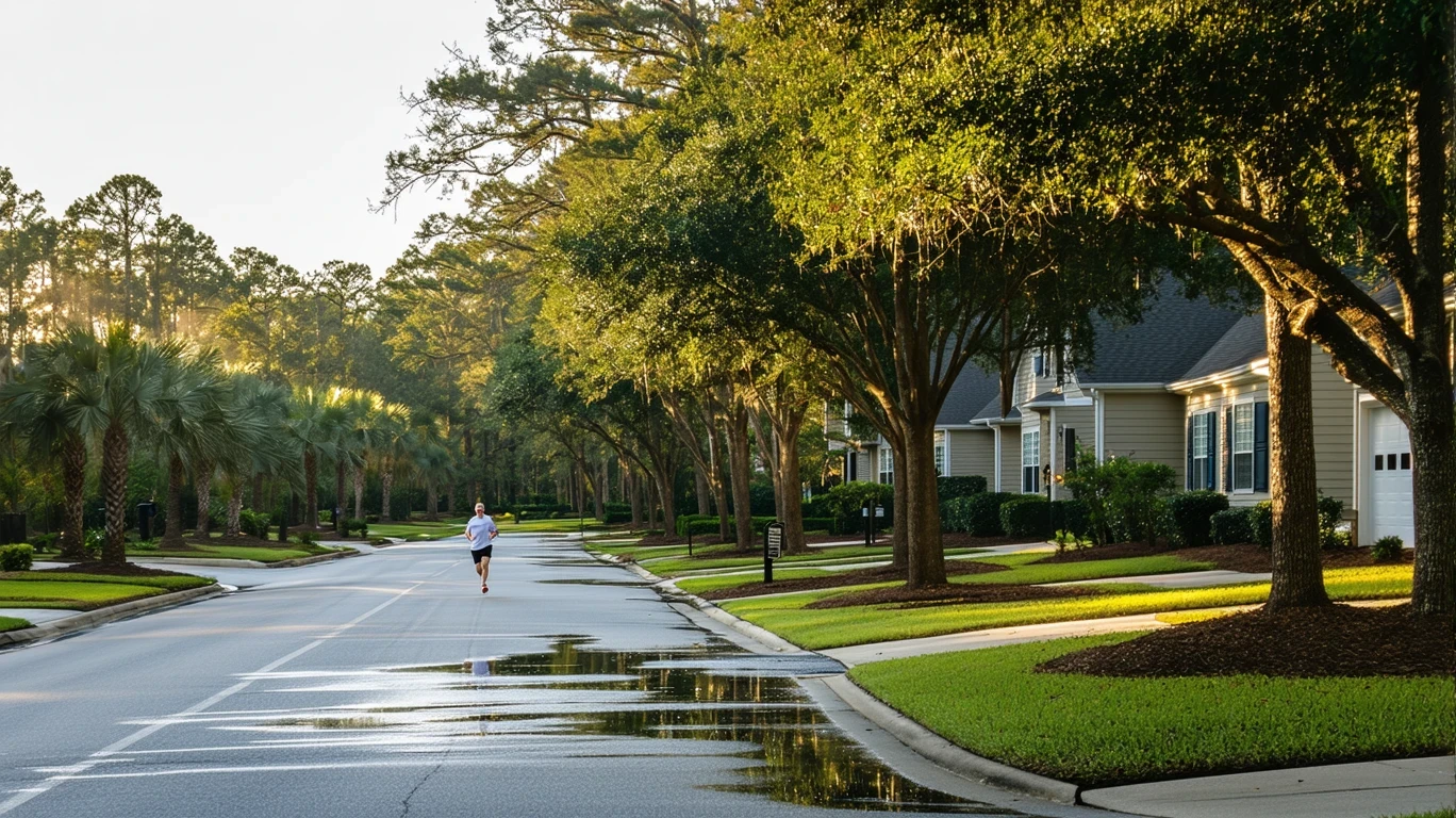 A tree-lined suburban street in Johns Creek, Georgia with puddles reflecting palm trees after a rain shower. A jogger runs along the sidewalk past well-kept homes.