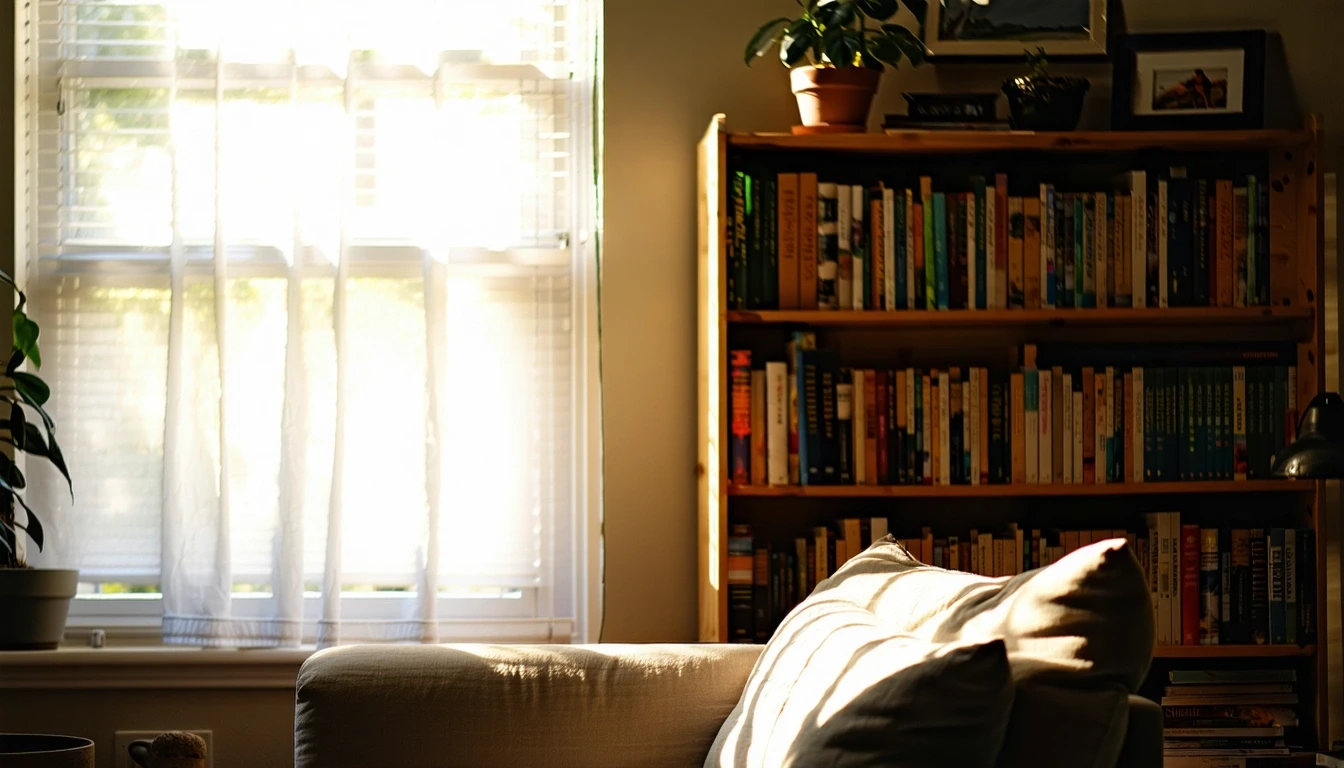 A sunlit living room with a couch and bookshelf in a Kansas City home.