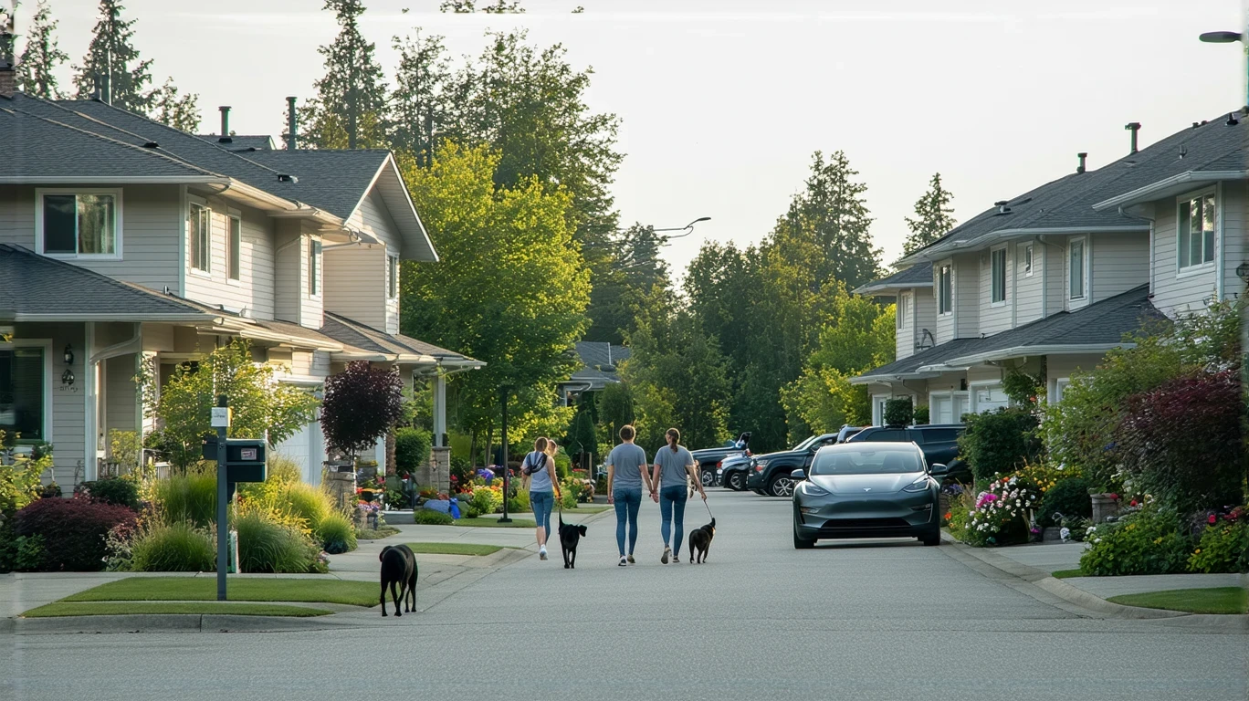 A suburban street in Kent, WA with craftsman homes, a couple walking a dog, and an electric car in a driveway.