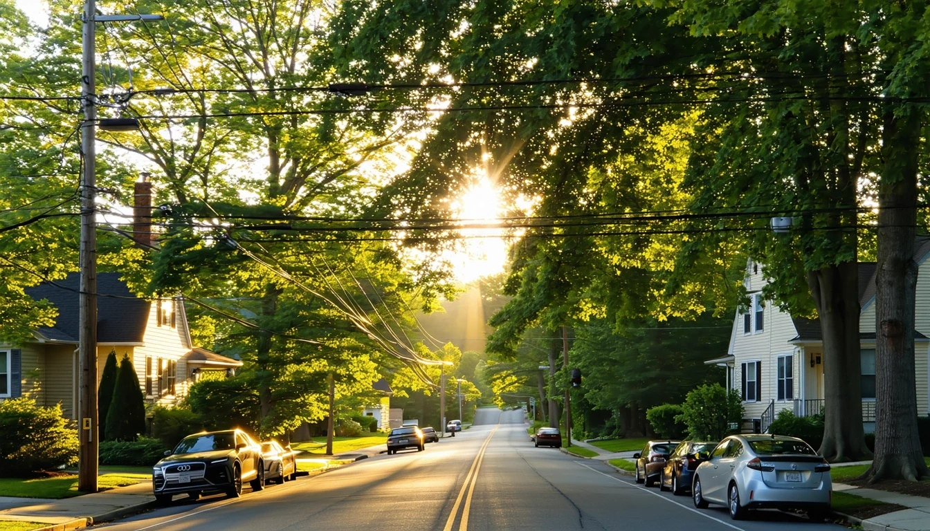 Quiet residential street in King Of Prussia, Pennsylvania with sunlight filtering through maple trees over single-family homes.