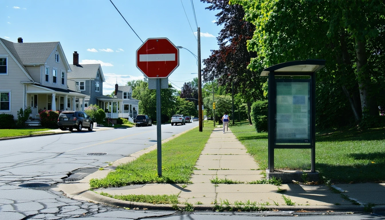 Typical residential street corner with bus stop in King Of Prussia, PA.