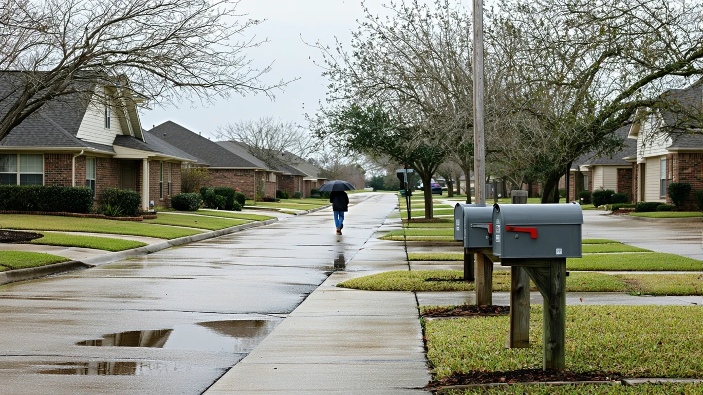 A curved sidewalk in a Kyle, Texas neighborhood with mailboxes and wet pavement on a cloudy day.