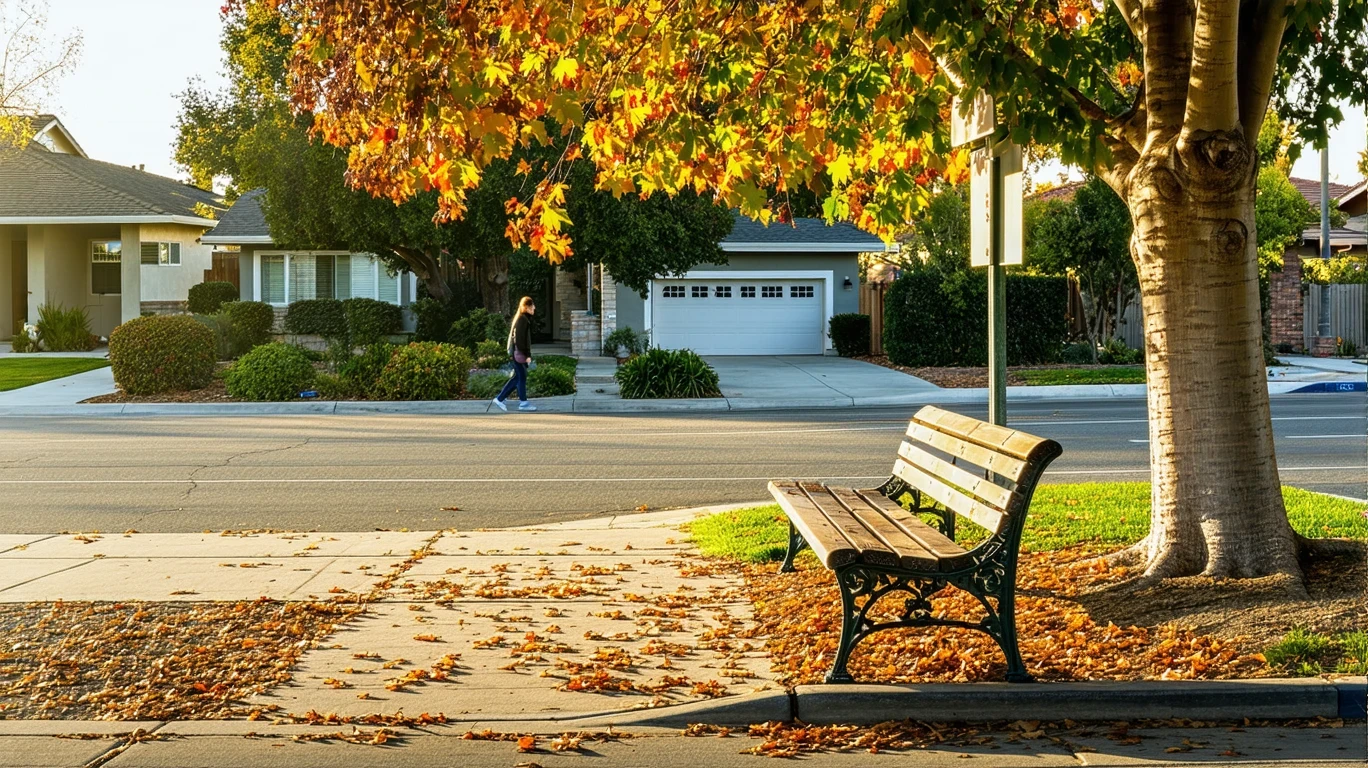 A wooden bench at a bus stop on a tree-lined suburban street in autumn, with fallen leaves on the sidewalk and homes in the background.