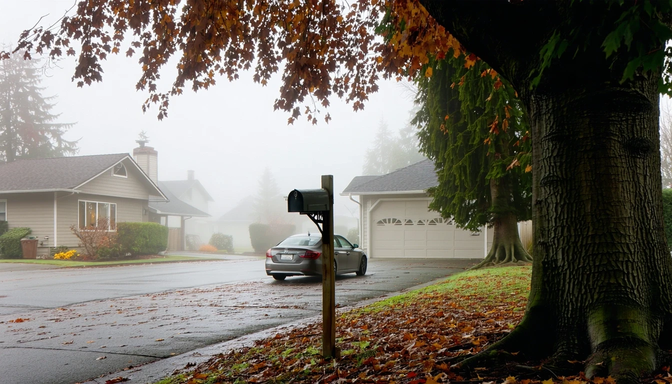 Misty morning street in Lake Oswego with mailbox, parked sedan, and maple tree
