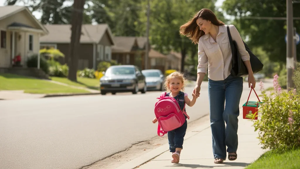 A young mother in Lakewood, CO walks home from daycare with her happy young daughter on a quiet suburban street.
