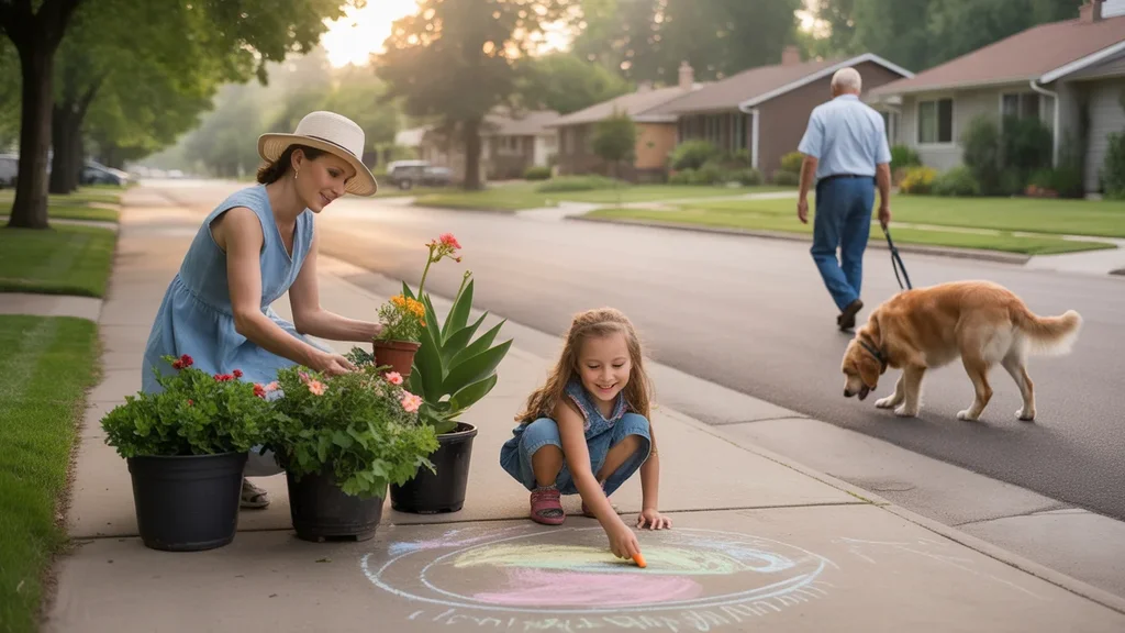 A woman waters potted plants in her Lakewood front yard as her daughter plays and a neighbor walks his dog on a peaceful suburban street.