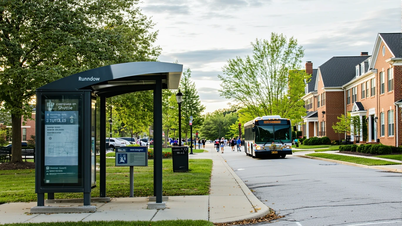 A campus shuttle stop with faded signage and a single shuttle, surrounded by academic buildings and tidy landscaping on an overcast day.