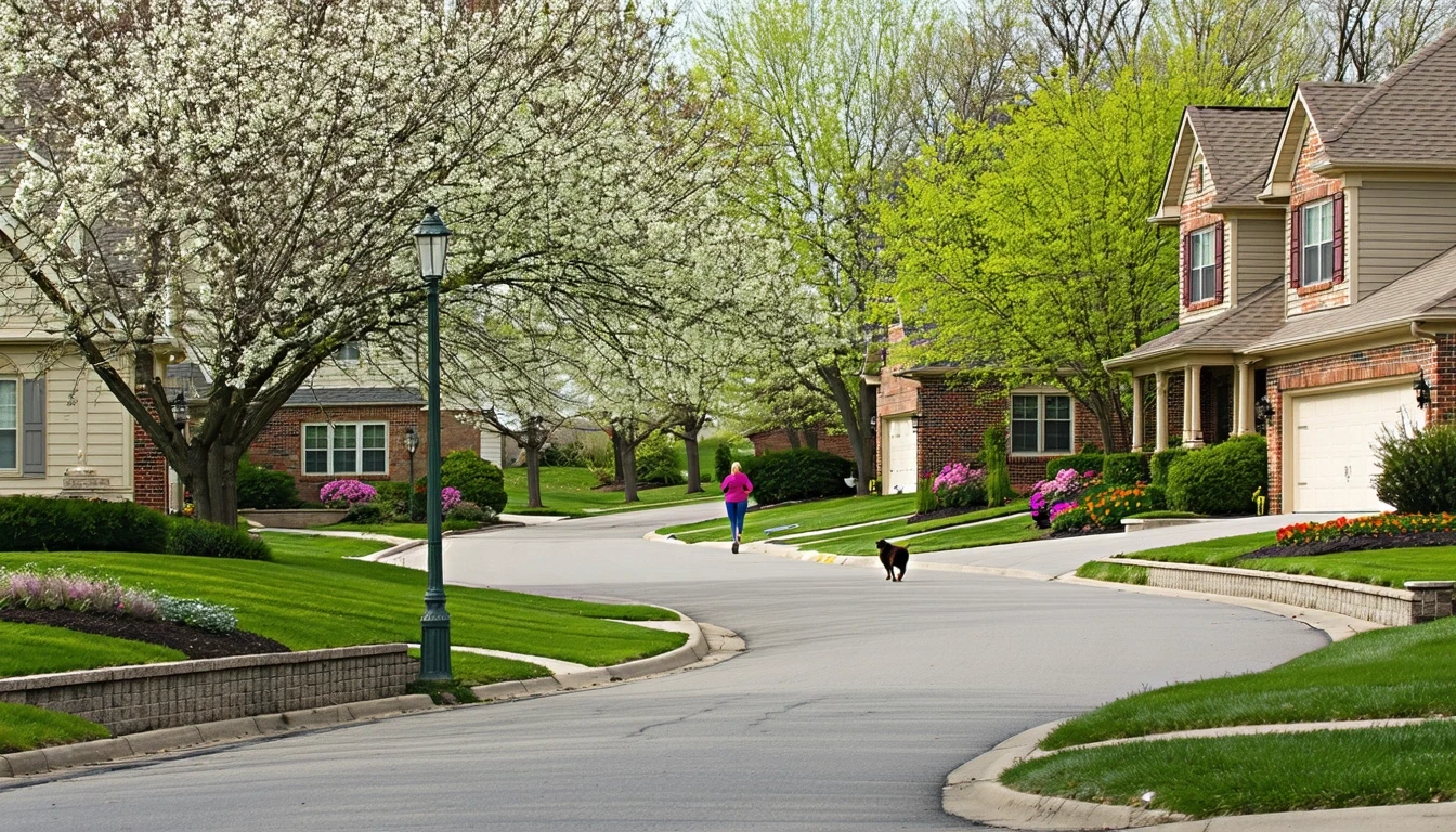 Suburban cul-de-sac in Lees Summit, Missouri with brick homes, blooming native trees, and a jogger on a spring morning.