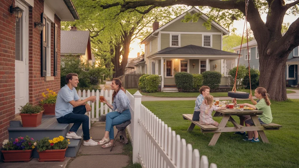 Two families in Lexington, KY chat between a red-brick duplex and a craftsman home with a picket fence.