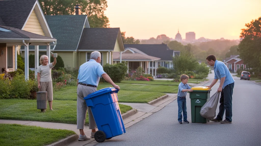 Neighbors in Lexington suburb rolling recycling bins to curb on peaceful morning