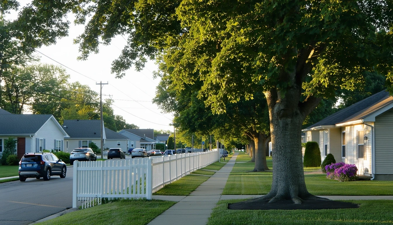 Suburban street in Liberty, Missouri with modest single-story homes and leafy trees in the early morning light.