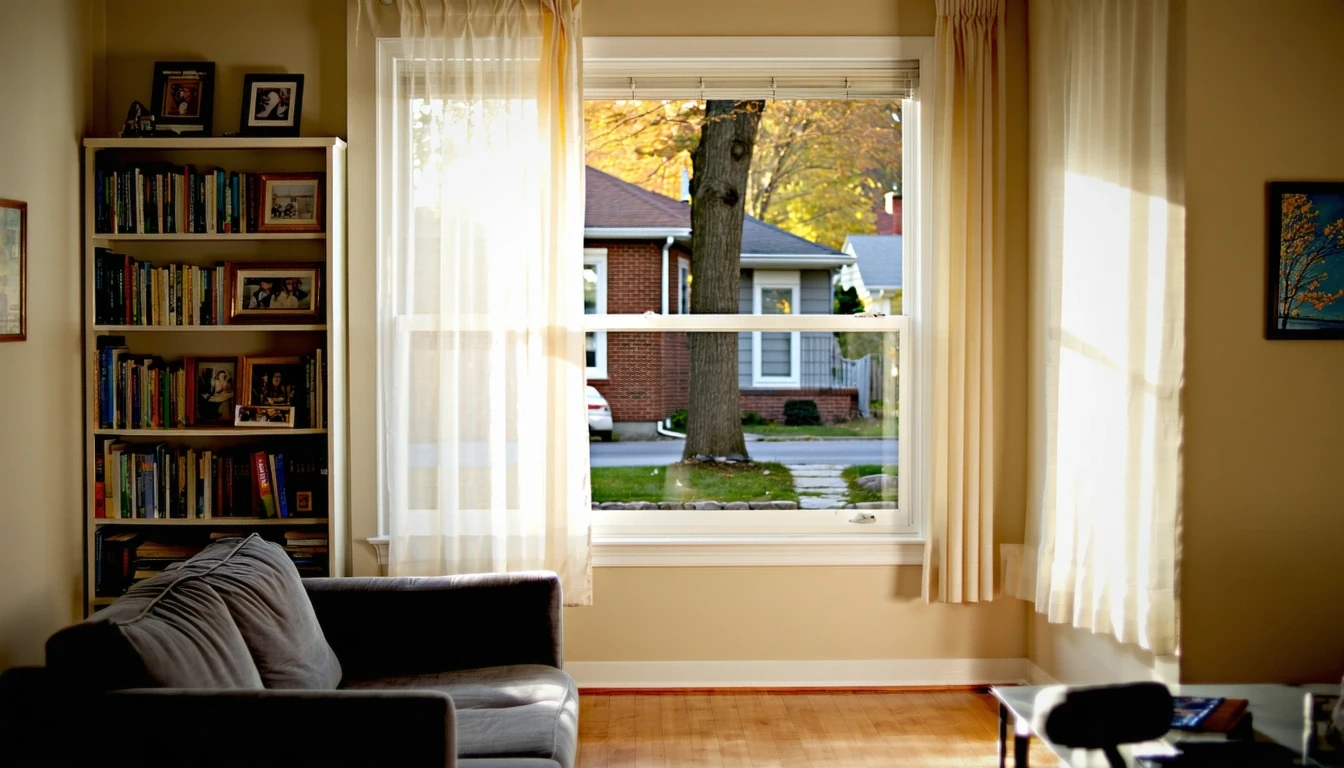 A cozy living room with a couch and bookshelf, sheer curtains letting in soft light, looking out on a quiet suburban street in Livonia, Michigan.