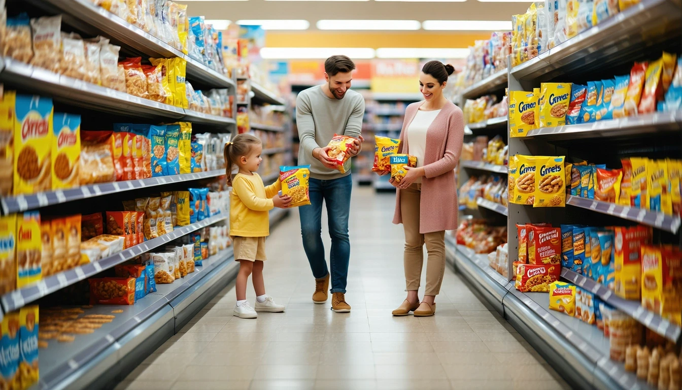 A family of three standing in a supermarket aisle, looking at cereal boxes on the shelf.