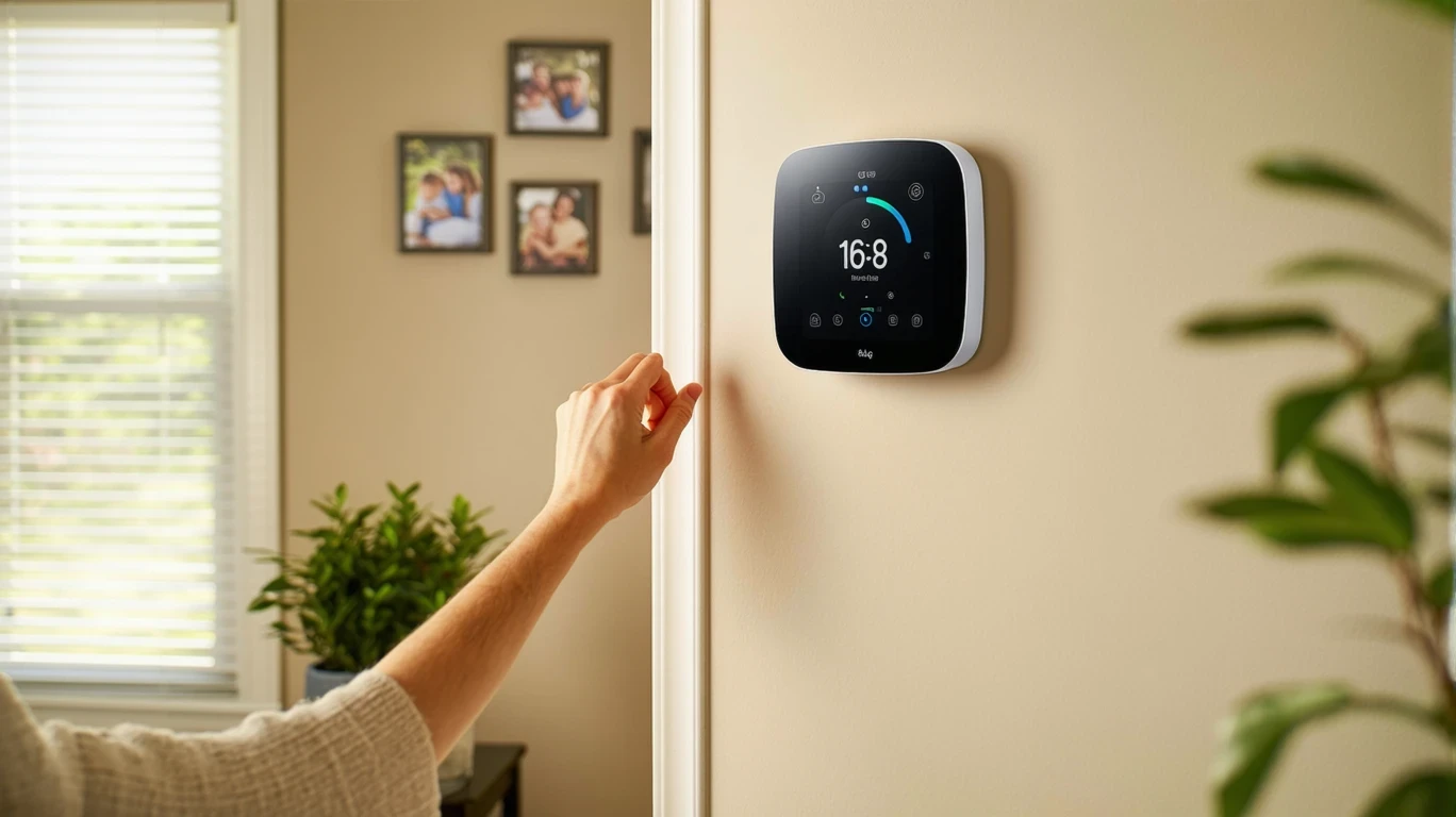 A hand reaching to adjust a smart thermostat mounted in a hallway.