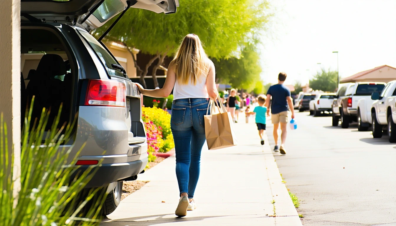 Woman loading groceries into car trunk in Mesa, AZ with neighborhood store in background