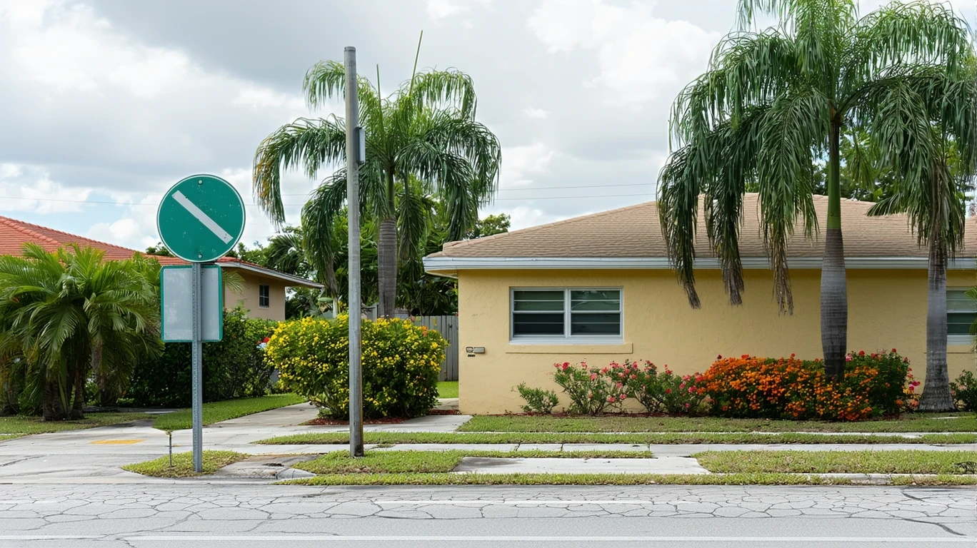 A residential street corner in Miami with a bus stop sign, sidewalk, and modest stucco homes.