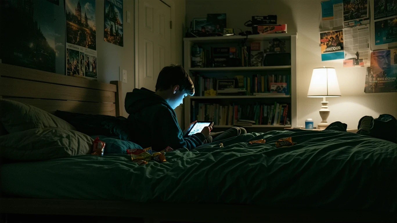 Teenage boy curled up on bed in dark bedroom, face lit by glowing tablet, snack wrappers and hoodie nearby.