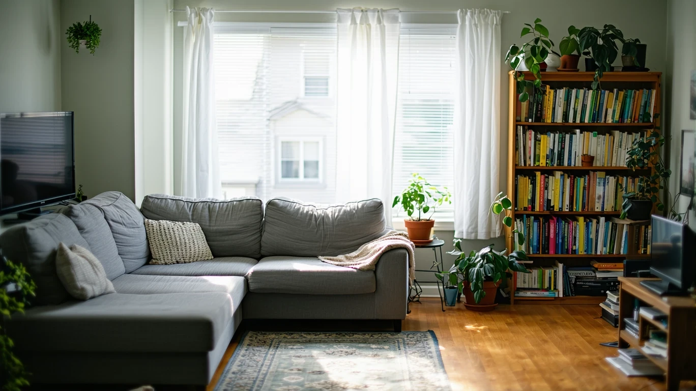 A small, simply furnished living room in Minneapolis with a couch, bookshelf, and warm natural light coming through sheer curtains.