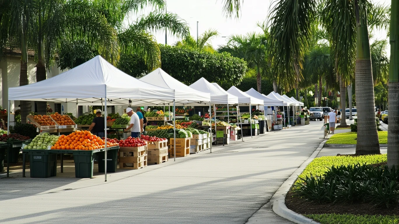 A suburban farmer's market in Miramar, Florida with vendors setting up produce under awnings on a sunny morning.