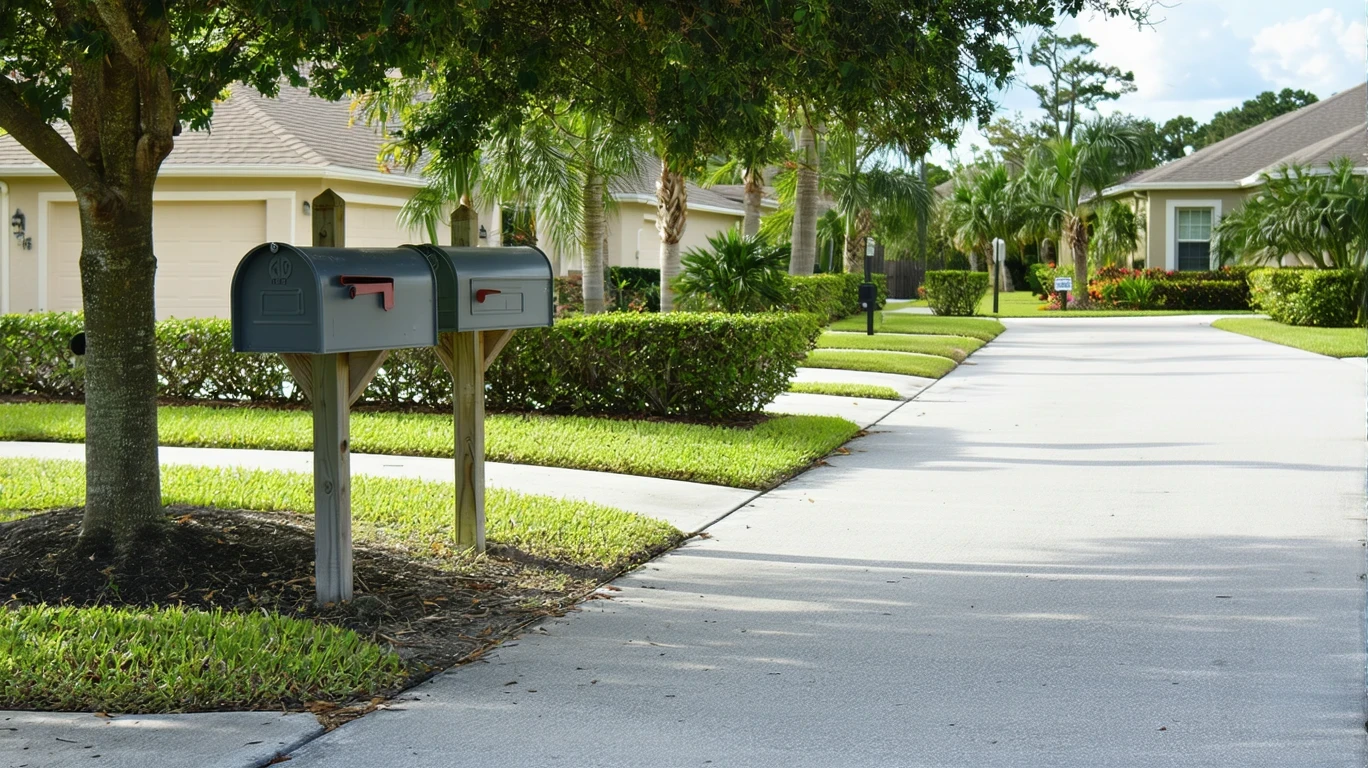 Mailboxes line a tidy sidewalk in a Miramar neighborhood.
